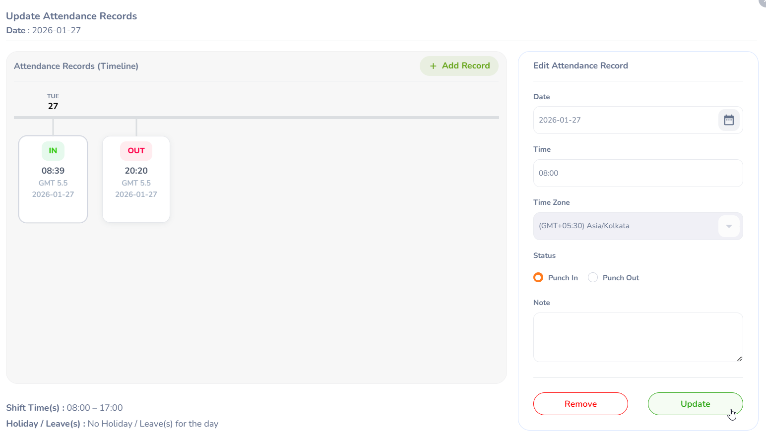 Step 06 - Once the necessary change has been made, click the "Update" button at the bottom of the screen to save the corrected attendance record.