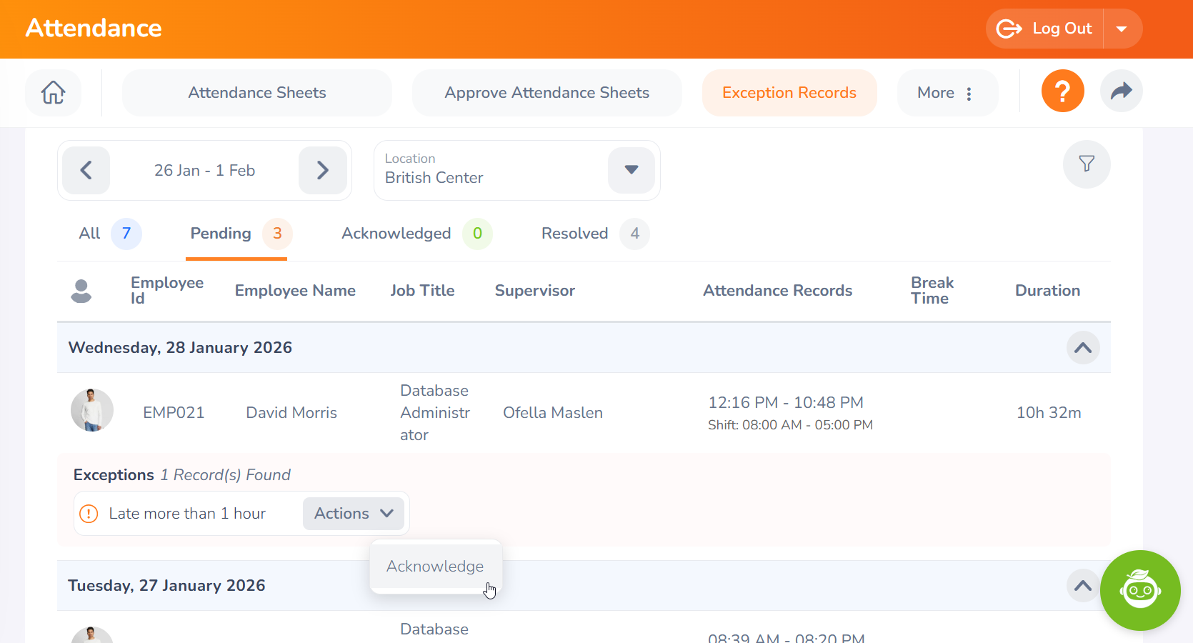 Step 01 - Select the attendance record from the list that you want to acknowledge and click on "Acknowledged" to acknowledge the attendance record.