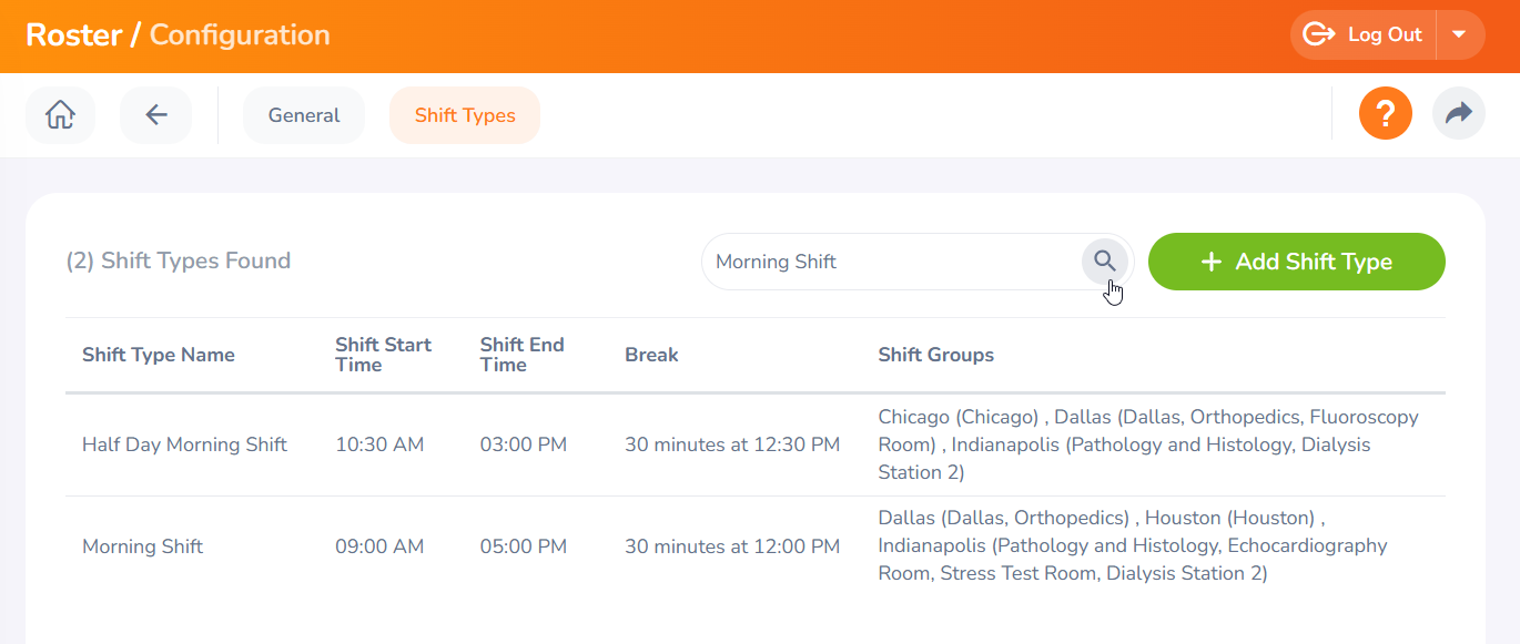 Step 04 - To search for a specific shift type, enter the name in the search bar and click the Search button.
