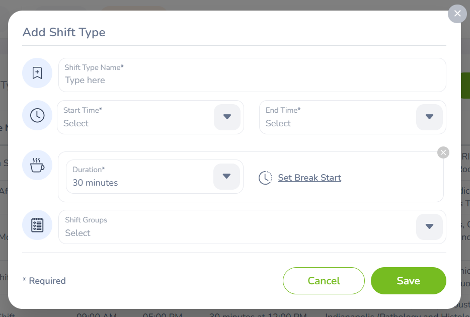 - Shift Type Name*: Enter a descriptive name for the shift (e.g., "Morning Shift").