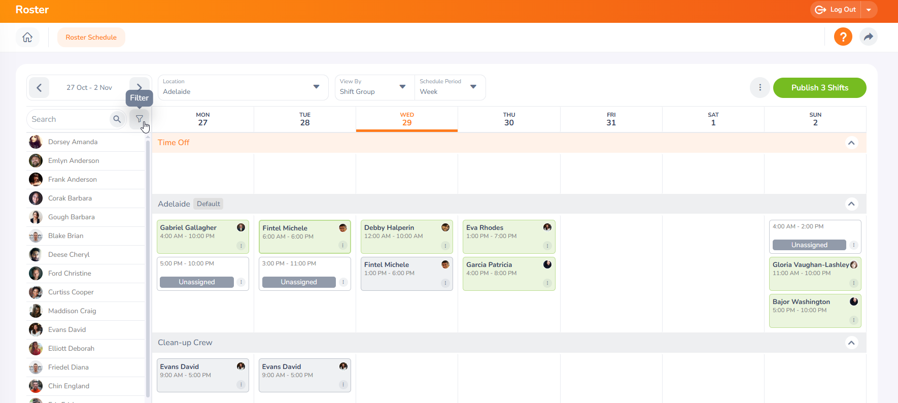 Step 01 - Click on the Filter button located at the top-left corner of the employee list on the left side of the roster.