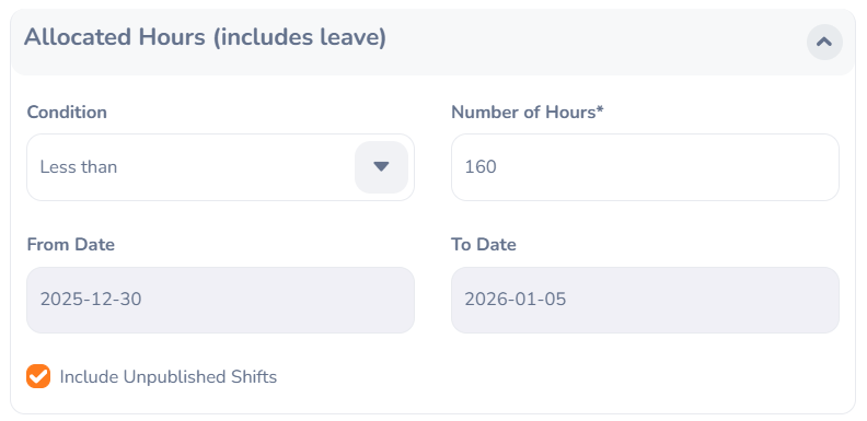 - Allocated Hours (includes leave) - The total hours assigned to an employee in the roster. This includes both scheduled work hours (Total Shift Hours) plus any approved leave hours taken within the same period.