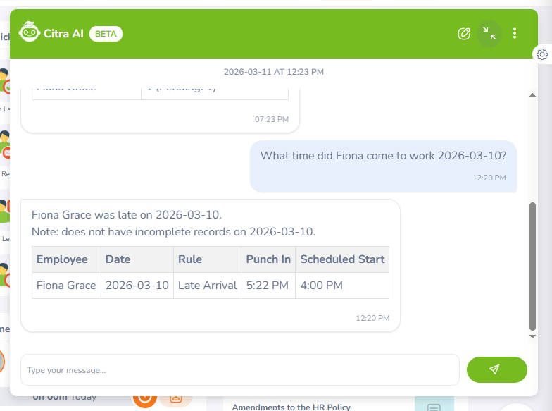 Citra AI can also help managers identify employees who were late based on their shift start times.