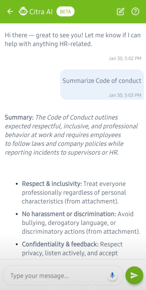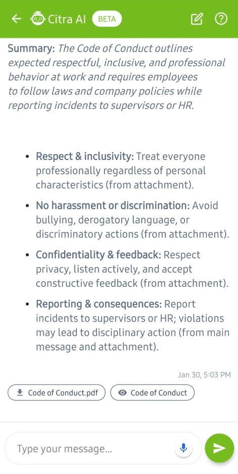 Citra AI can now summarize published company news and policies, making it easier for employees to quickly grasp key information without reading through lengthy documents. Simply ask Citra for a summary of the latest announcements or a specific policy, and it will provide a concise overview.