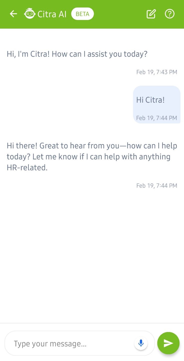Citra AI now supports voice-to-text functionality, allowing employees to perform tasks using spoken commands instead of typing. Simply tap the microphone icon and speak naturally, whether it's applying for leave, checking attendance, or asking for policy summaries. Citra AI will convert your speech into text and process your request instantly.
