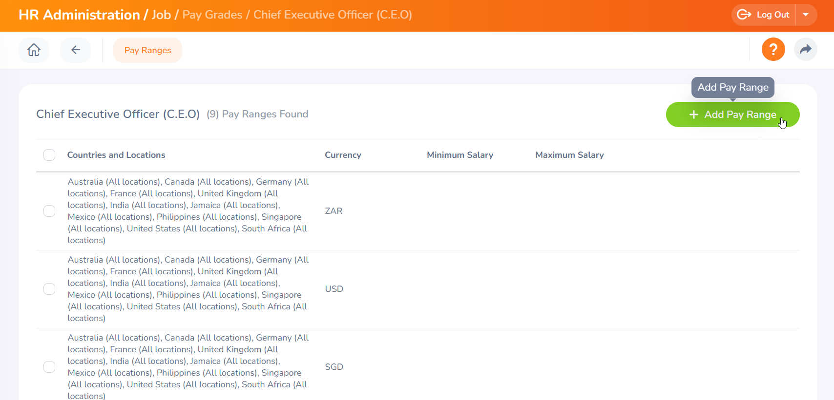 Step 2 - After clicking, the Pay Ranges screen will appear for the selected pay grade. You can add a new pay range by clicking the Add Pay Range button.