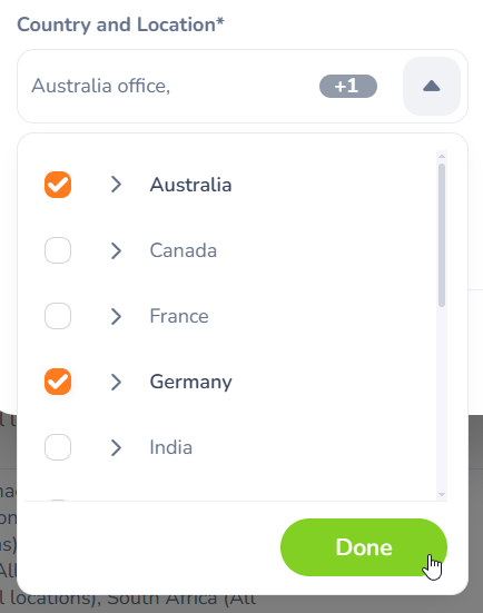 Select the required Countries and Locations from the dropdown menus. Once selected, click the Done button to add them. |
