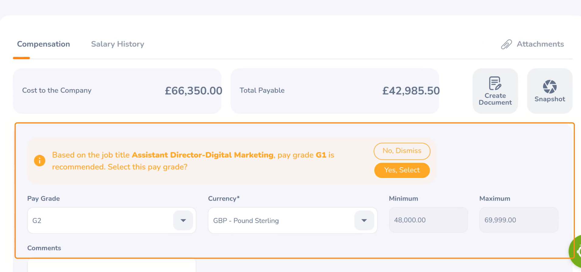 The system will now detect the most suitable pay grade based on the job title and provide a suggestion. You can click Yes to update the pay grade or click Dismiss to cancel the suggestion.