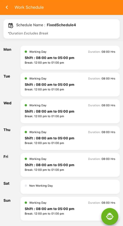 Admins can view their work schedule as well as their employees' work schedule by clicking the "View Work Schedule" button. This will display a detailed view of the assigned schedules.